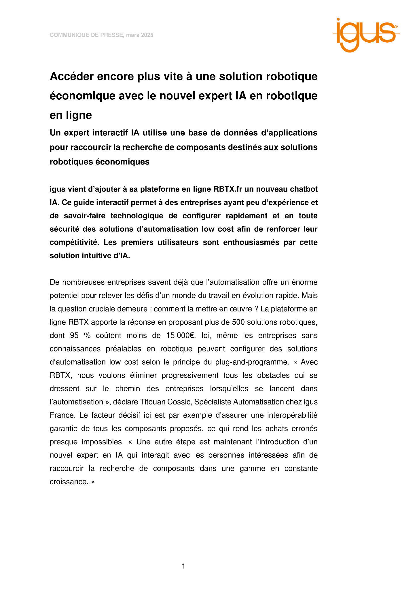 De nombreuses entreprises savent déjà que l’automatisation offre un énorme potentiel pour relever les défis d’un monde du travail en évolution rapide. Mais la question cruciale demeure : comment la mettre en œuvre ? La plateforme en ligne RBTX apporte la réponse en proposant plus de 500 solutions robotiques, dont 95 % coûtent moins de 15 000€. Ici, même les entreprises sans connaissances préalables en robotique peuvent configurer des solutions d’automatisation low cost selon le principe du plug-and-programme. « Avec RBTX, nous voulons éliminer progressivement tous les obstacles qui se dressent sur le chemin des entreprises lorsqu’elles se lancent dans l’automatisation », déclare Titouan Cossic, Spécialiste Automatisation chez igus France. Le facteur décisif ici est par exemple d’assurer une interopérabilité garantie de tous les composants proposés, ce qui rend les achats erronés presque impossibles. « Une autre étape est maintenant l’introduction d’un nouvel expert en IA qui interagit avec les personnes intéressées afin de raccourcir la recherche de composants dans une gamme en constante croissance. »