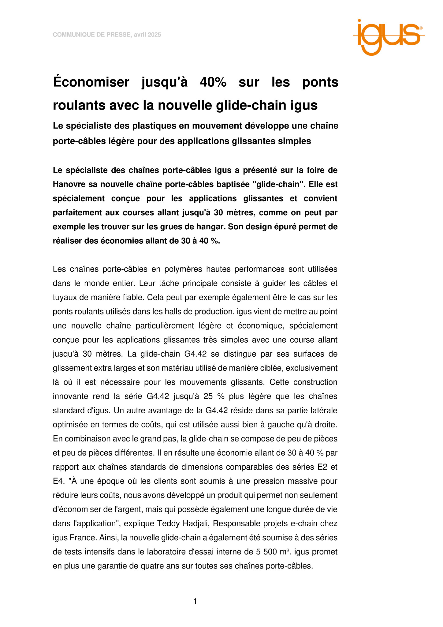 Les chaînes porte-câbles en polymères hautes performances sont utilisées dans le monde entier. Leur tâche principale consiste à guider les câbles et tuyaux de manière fiable. Cela peut par exemple également être le cas sur les ponts roulants utilisés dans les halls de production. igus vient de mettre au point une nouvelle chaîne particulièrement légère et économique, spécialement conçue pour les applications glissantes très simples avec une course allant jusqu’à 30 mètres. La glide-chain G4.42 se distingue par ses surfaces de glissement extra larges et son matériau utilisé de manière ciblée, exclusivement là où il est nécessaire pour les mouvements glissants. Cette construction innovante rend la série G4.42 jusqu’à 25 % plus légère que les chaînes standard d’igus. Un autre avantage de la G4.42 réside dans sa partie latérale optimisée en termes de coûts, qui est utilisée aussi bien à gauche qu’à droite. En combinaison avec le grand pas, la glide-chain se compose de peu de pièces et peu de pièces différentes. Il en résulte une économie allant de 30 à 40 % par rapport aux chaînes standards de dimensions comparables des séries E2 et E4. « À une époque où les clients sont soumis à une pression massive pour réduire leurs coûts, nous avons développé un produit qui permet non seulement d’économiser de l’argent, mais qui possède également une longue durée de vie dans l’application », explique Teddy Hadjali, Responsable projets e-chain chez igus France. Ainsi, la nouvelle glide-chain a également été soumise à des séries de tests intensifs dans le laboratoire d’essai interne de 5 500 m². igus promet en plus une garantie de quatre ans sur toutes ses chaînes porte-câbles.