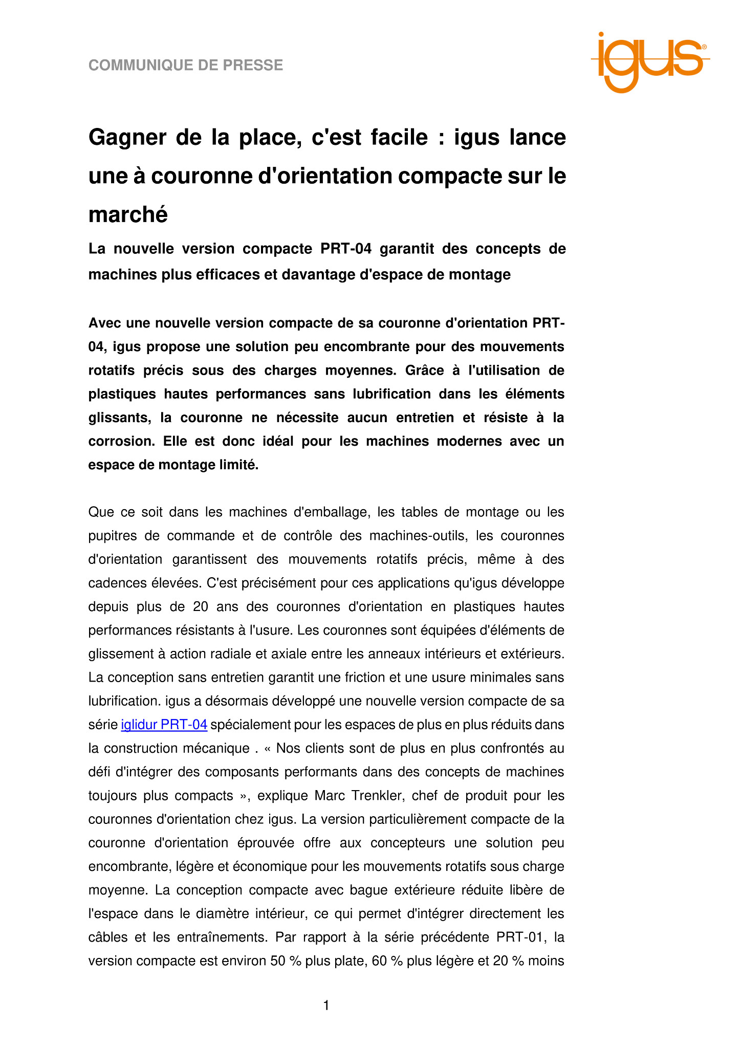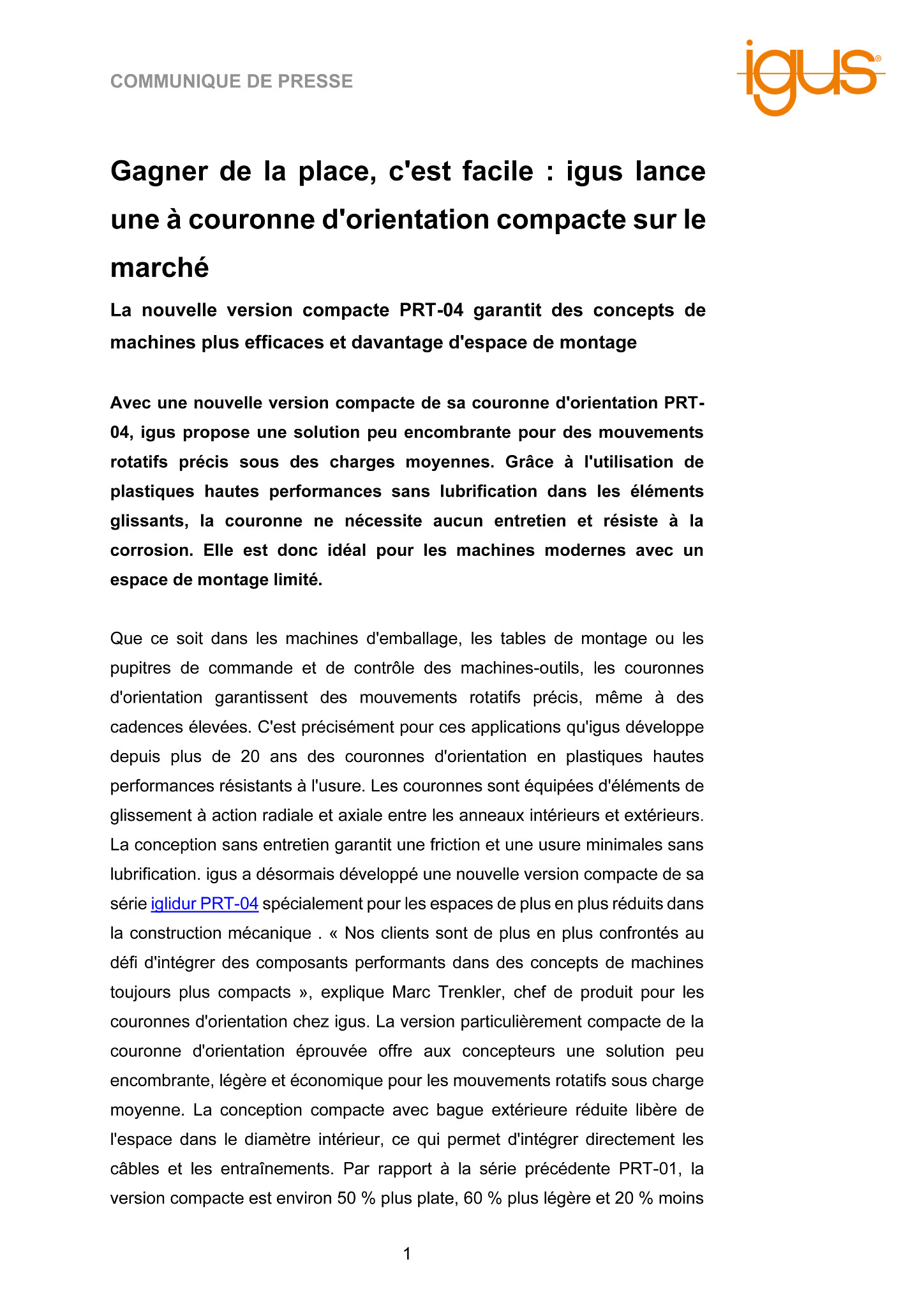 Avec une nouvelle version compacte de sa couronne d’orientation PRT-04, igus propose une solution peu encombrante pour des mouvements rotatifs précis sous des charges moyennes. Grâce à l’utilisation de plastiques hautes performances sans lubrification dans les éléments glissants, la couronne ne nécessite aucun entretien et résiste à la corrosion. Elle est donc idéal pour les machines modernes avec un espace de montage limité.
