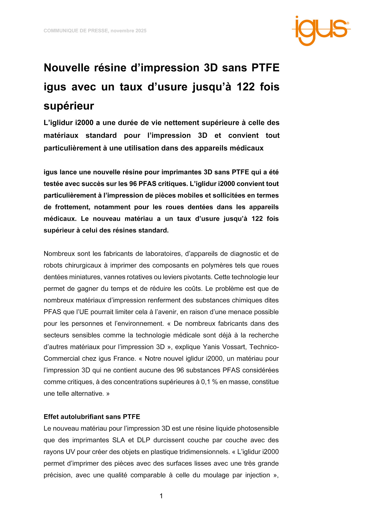 Nombreux sont les fabricants de laboratoires, d’appareils de diagnostic et de robots chirurgicaux à imprimer des composants en polymères tels que roues dentées miniatures, vannes rotatives ou leviers pivotants. Cette technologie leur permet de gagner du temps et de réduire les coûts. Le problème est que de nombreux matériaux d’impression renferment des substances chimiques dites PFAS que l’UE pourrait limiter cela à l’avenir, en raison d’une menace possible pour les personnes et l’environnement. « De nombreux fabricants dans des secteurs sensibles comme la technologie médicale sont déjà à la recherche d’autres matériaux pour l’impression 3D », explique Yanis Vossart, Technico-Commercial chez igus France. « Notre nouvel iglidur i2000, un matériau pour l’impression 3D qui ne contient aucune des 96 substances PFAS considérées comme critiques, à des concentrations supérieures à 0,1 % en masse, constitue une telle alternative. »