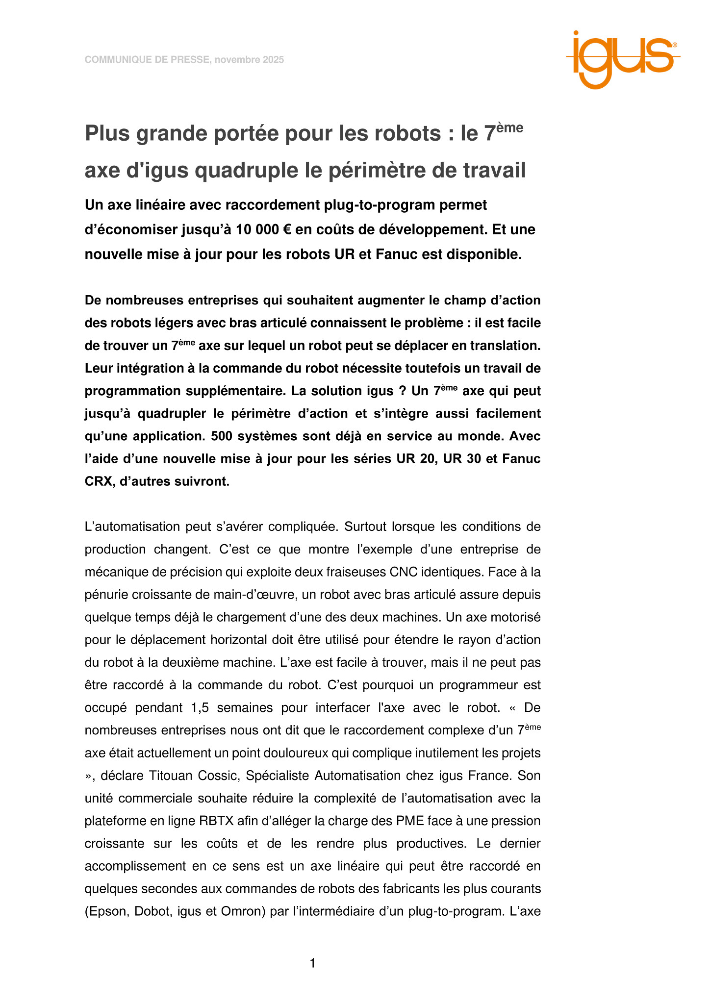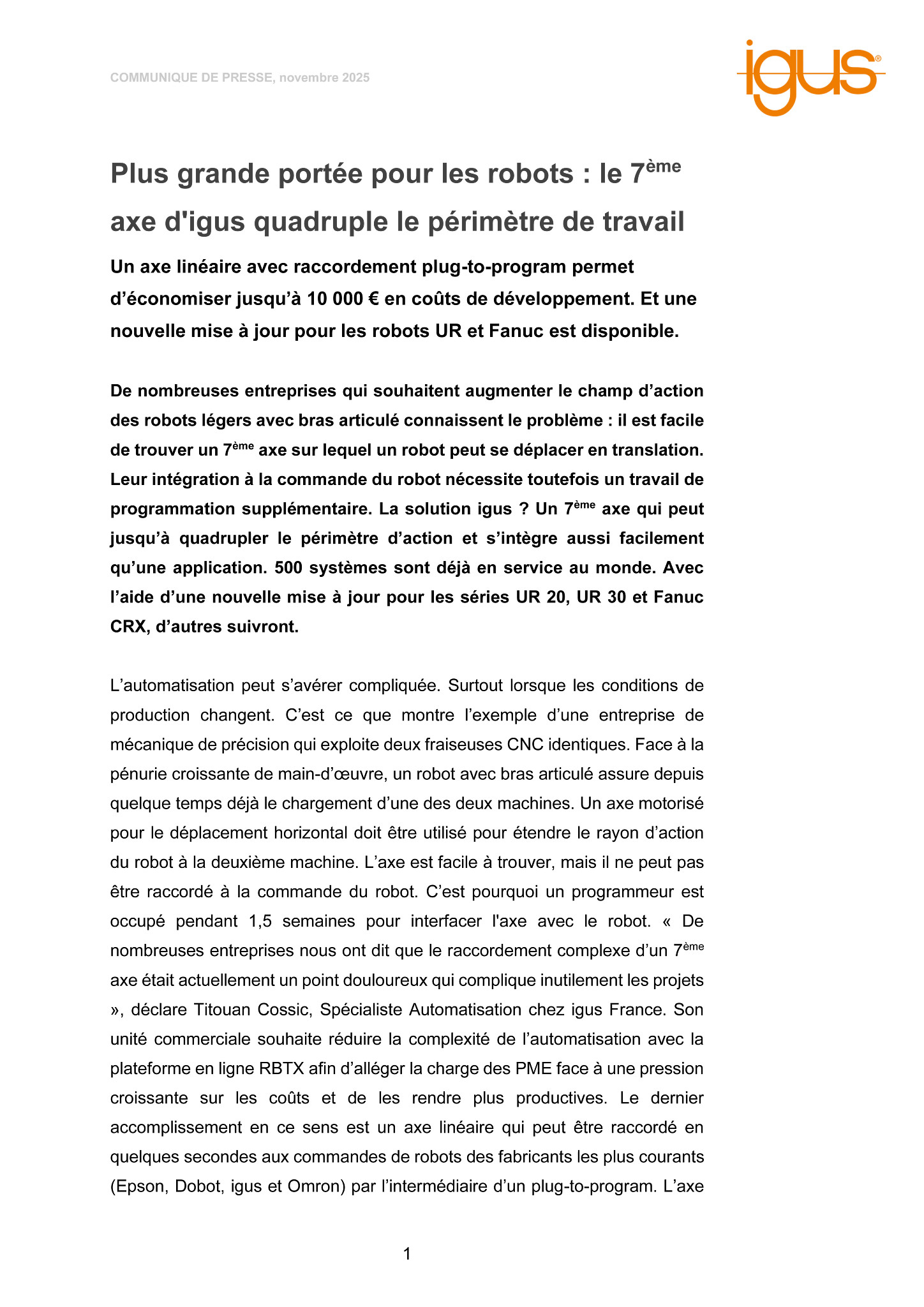L’automatisation peut s’avérer compliquée. Surtout lorsque les conditions de production changent. C’est ce que montre l’exemple d’une entreprise de mécanique de précision qui exploite deux fraiseuses CNC identiques. Face à la pénurie croissante de main-d’œuvre, un robot avec bras articulé assure depuis quelque temps déjà le chargement d’une des deux machines. Un axe motorisé pour le déplacement horizontal doit être utilisé pour étendre le rayon d’action du robot à la deuxième machine. L’axe est facile à trouver, mais il ne peut pas être raccordé à la commande du robot. C’est pourquoi un programmeur est occupé pendant 1,5 semaines pour interfacer l’axe avec le robot. « De nombreuses entreprises nous ont dit que le raccordement complexe d’un 7ème axe était actuellement un point douloureux qui complique inutilement les projets », déclare Titouan Cossic, Spécialiste Automatisation chez igus France. Son unité commerciale souhaite réduire la complexité de l’automatisation avec la plateforme en ligne RBTX afin d’alléger la charge des PME face à une pression croissante sur les coûts et de les rendre plus productives. Le dernier accomplissement en ce sens est un axe linéaire qui peut être raccordé en quelques secondes aux commandes de robots des fabricants les plus courants (Epson, Dobot, igus et Omron) par l’intermédiaire d’un plug-to-program. L’axe 7 est maintenant également compatible avec les robots Universal Robots UR 20 et UR 30 ainsi qu’avec les séries Fanuc CRX. « Les premiers utilisateurs rapportent avoir économisé jusqu’à 10.000 € sur les coûts de développement grâce au principe du plug-to-program », explique le spécialiste en robotique.