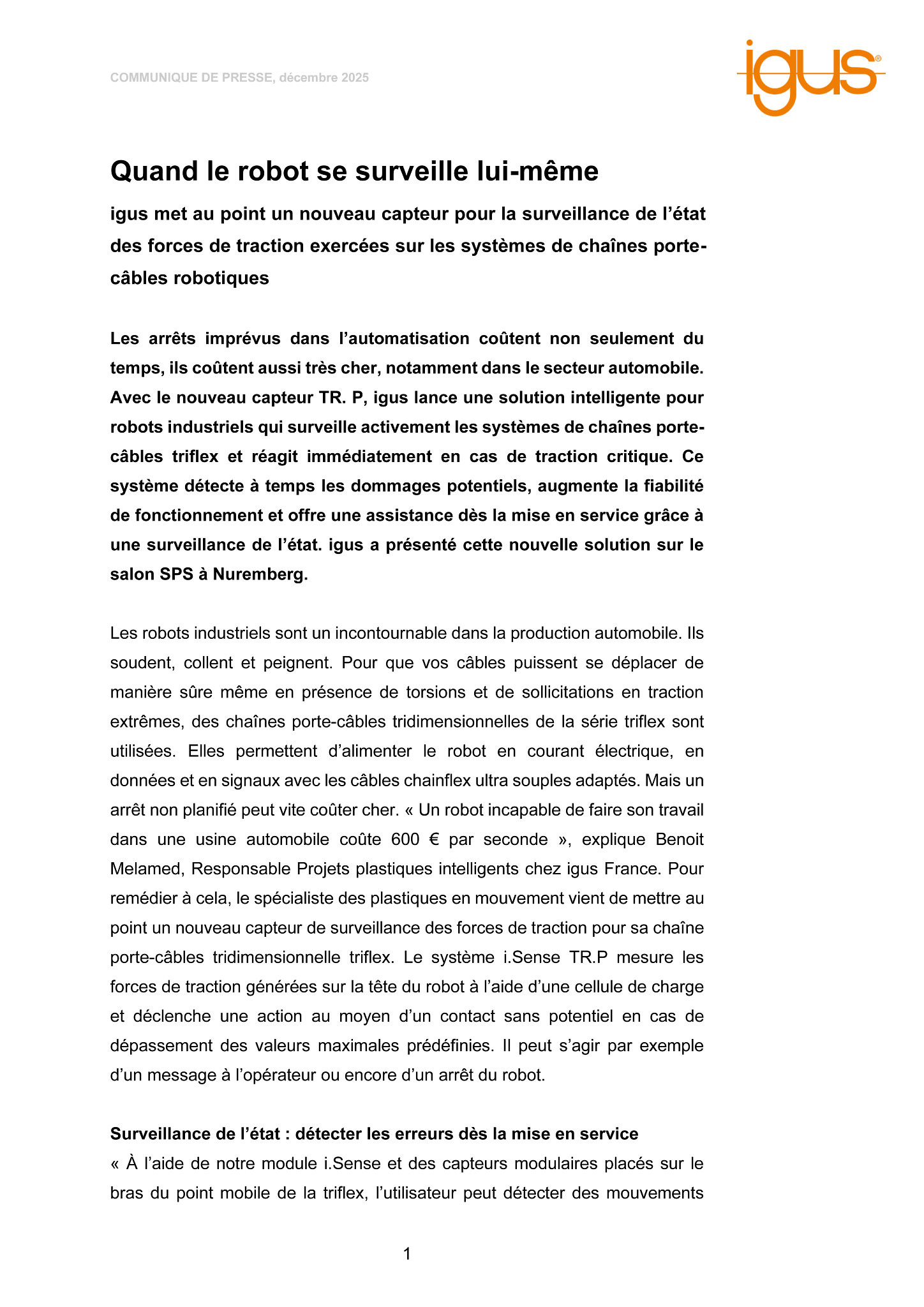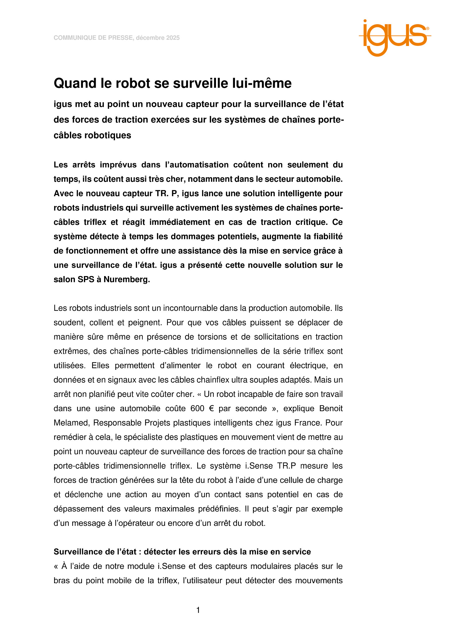 Les arrêts imprévus dans l’automatisation coûtent non seulement du temps, ils coûtent aussi très cher, notamment dans le secteur automobile. Avec le nouveau capteur TR. P, igus lance une solution intelligente pour robots industriels qui surveille activement les systèmes de chaînes porte-câbles triflex et réagit immédiatement en cas de traction critique. Ce système détecte à temps les dommages potentiels, augmente la fiabilité de fonctionnement et offre une assistance dès la mise en service grâce à une surveillance de l’état. igus a présenté cette nouvelle solution sur le salon SPS à Nuremberg.