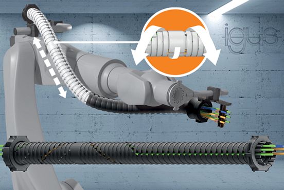 Les robots industriels ont besoin d’un guidage des câbles qui soit sûr, léger et compact. C’est pour y répondre qu’igus a mis au point la chaîne porte-câbles « quadridimensionnelle » triflex TRX. Ce nouveau design prend la relève des accastillages de robot et des systèmes de rappel classiques. Son originalité réside dans un mécanisme télescopique unique en son genre placé à l’intérieur de la chaîne et qui permet une variation de longueur de 40 %. Les utilisateurs de robots économisent ainsi, au niveau de l’axe 3, de la place, jusqu’à 83 % de poids et les coûts liées liés à un système de rappel classique.